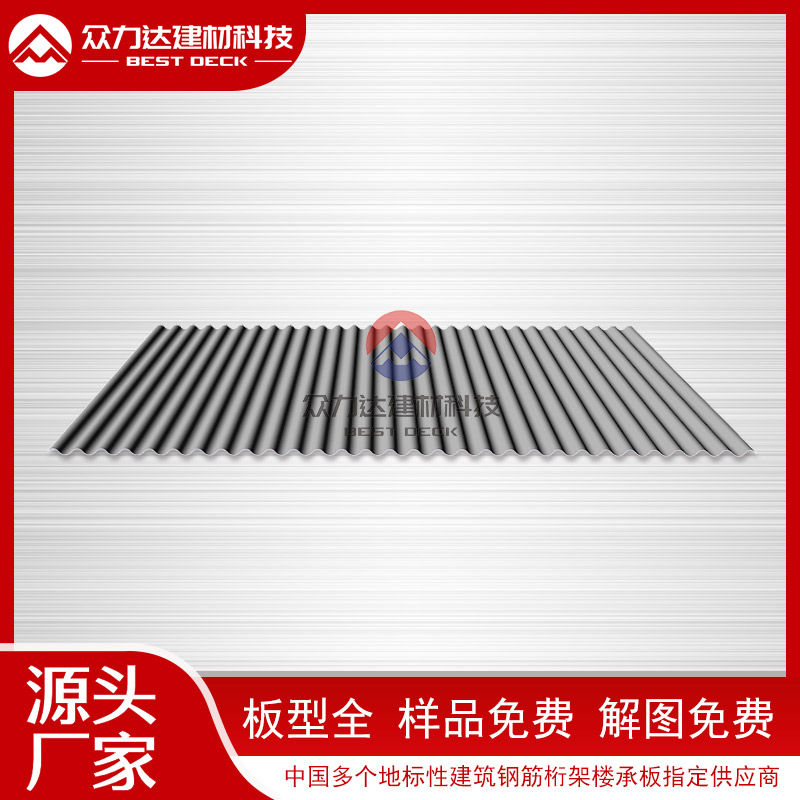 1.壓型鋼板一般采用0.75~1.6mm厚的Q235薄鋼板冷軋制而成。用于組合板的壓型鋼板,其凈厚度(不包括鍍鋅層或飾面層的厚度)不小于0.75mm。